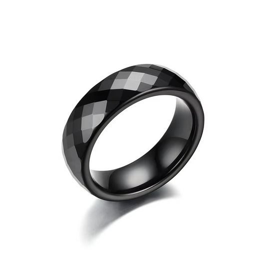 This sleek and modern 8mm black ceramic ring features a faceted polished surface and a...