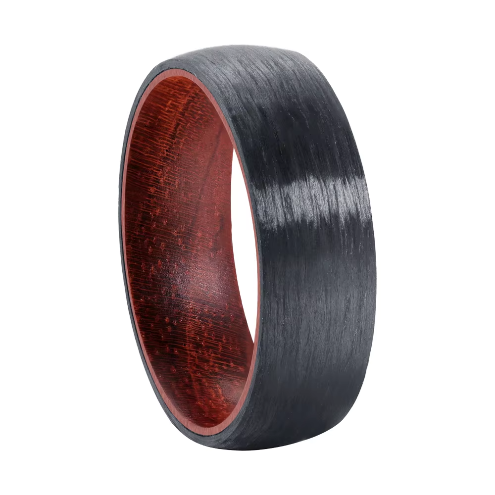 8mm dome carbon fiber ring with wood inside from Orivon Jewelers—a high quality, premium build that pairs a sleek carbon-fiber shell with a warm, sealed wood interior for natural contrast. The domed profile and comfort-fit interior make all-day wear effortless, while beveled edges and a resilient finish keep it smooth and low-maintenance. Hypoallergenic / nickel-safe and color-stable, this modern band arrives gift-ready with fast, tracked shipping and easy returns—refined luxury men’s jewelry for weddings, stacking, or a standout gift for him.