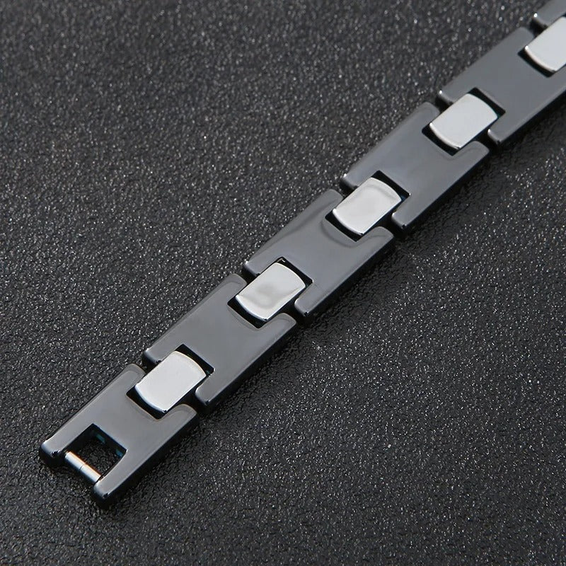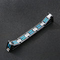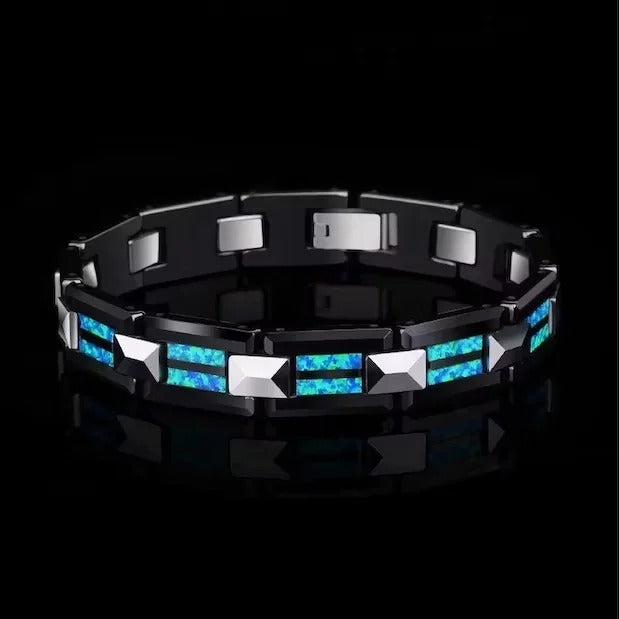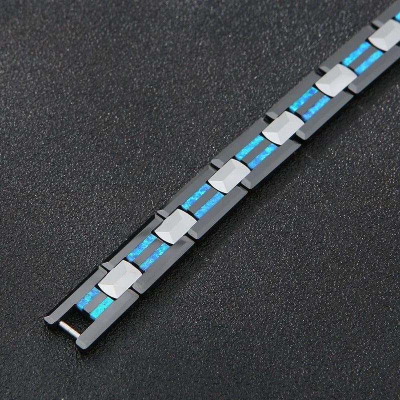 Ultra premuim Black Ceramics Blue Fire Opal Tungsten Bracelet from Orivon Jewelers—a high-quality, luxury link bracelet combining durable tungsten with sleek black ceramic accents and a luminous blue fire opal inlay that flashes electric color with every move. Engineered for daily wear, it features a mirror-polished finish, smooth articulation, and a low-profile secure clasp—modern, masculine, and gift-ready.