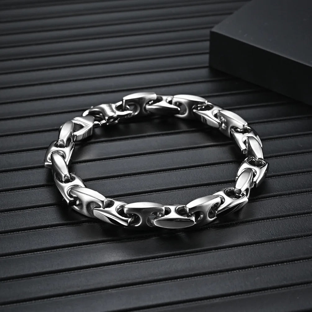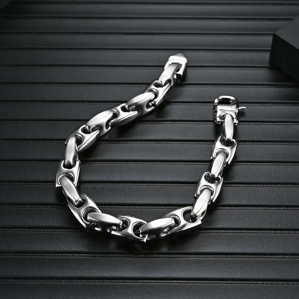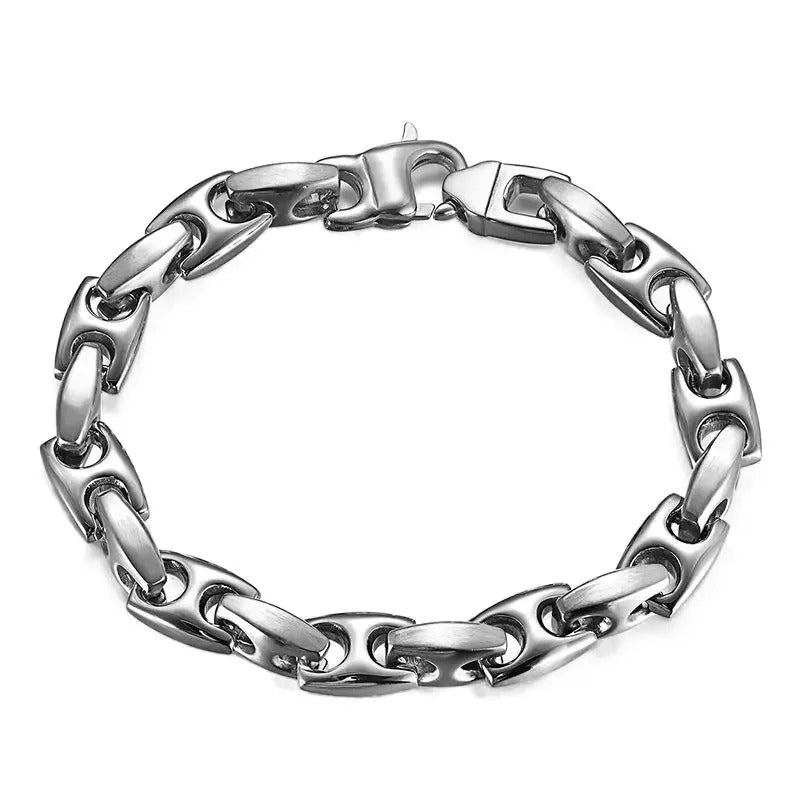 Link Chain Desgin Tungsten Bracelet from Orivon Jewelers—a premium, high-quality piece engineered in durable tungsten with a sleek link-chain profile and mirror polish. Substantial yet comfortable on the wrist, it glides smoothly thanks to rounded edges and a low-profile clasp. Built to hold its shine through daily wear and easy to style from office to weekend, it arrives gift-ready for any occasion.