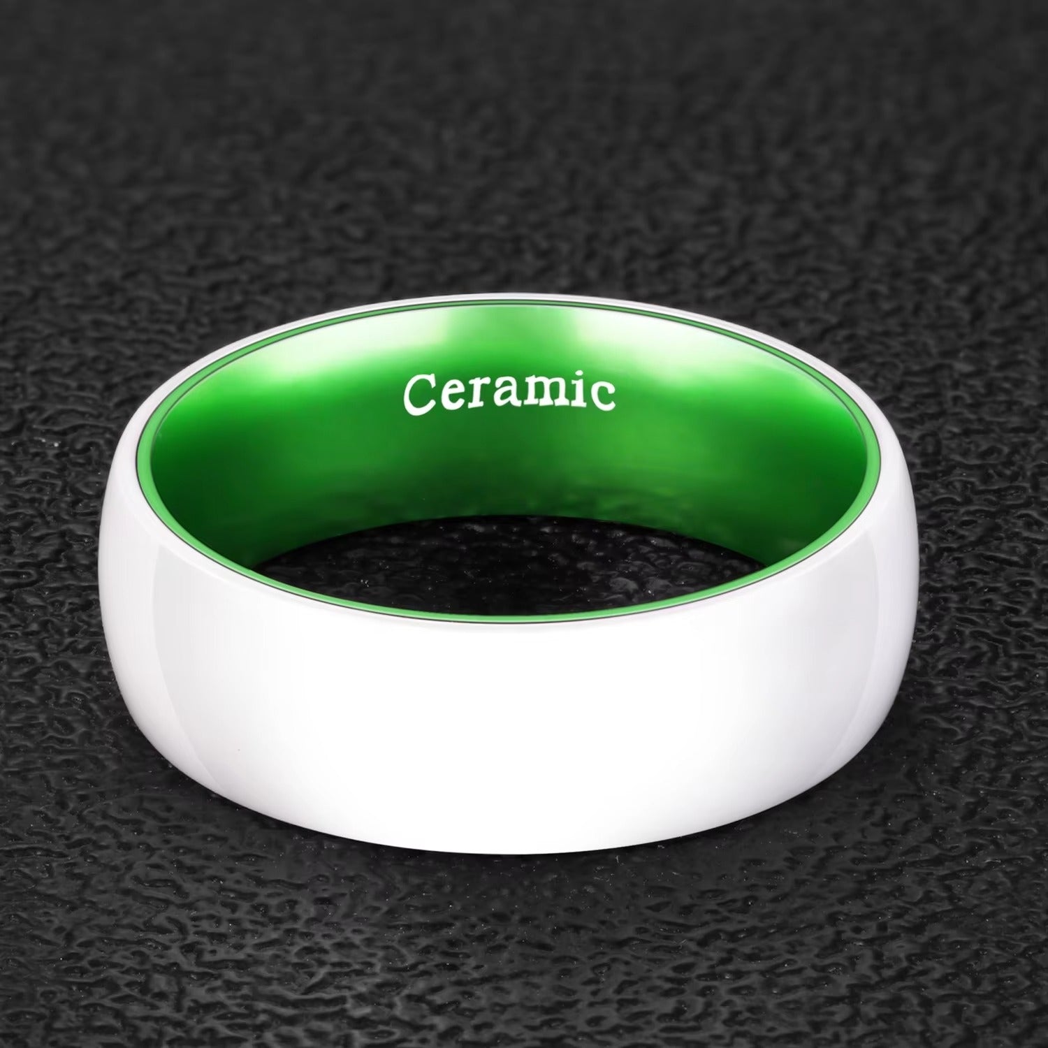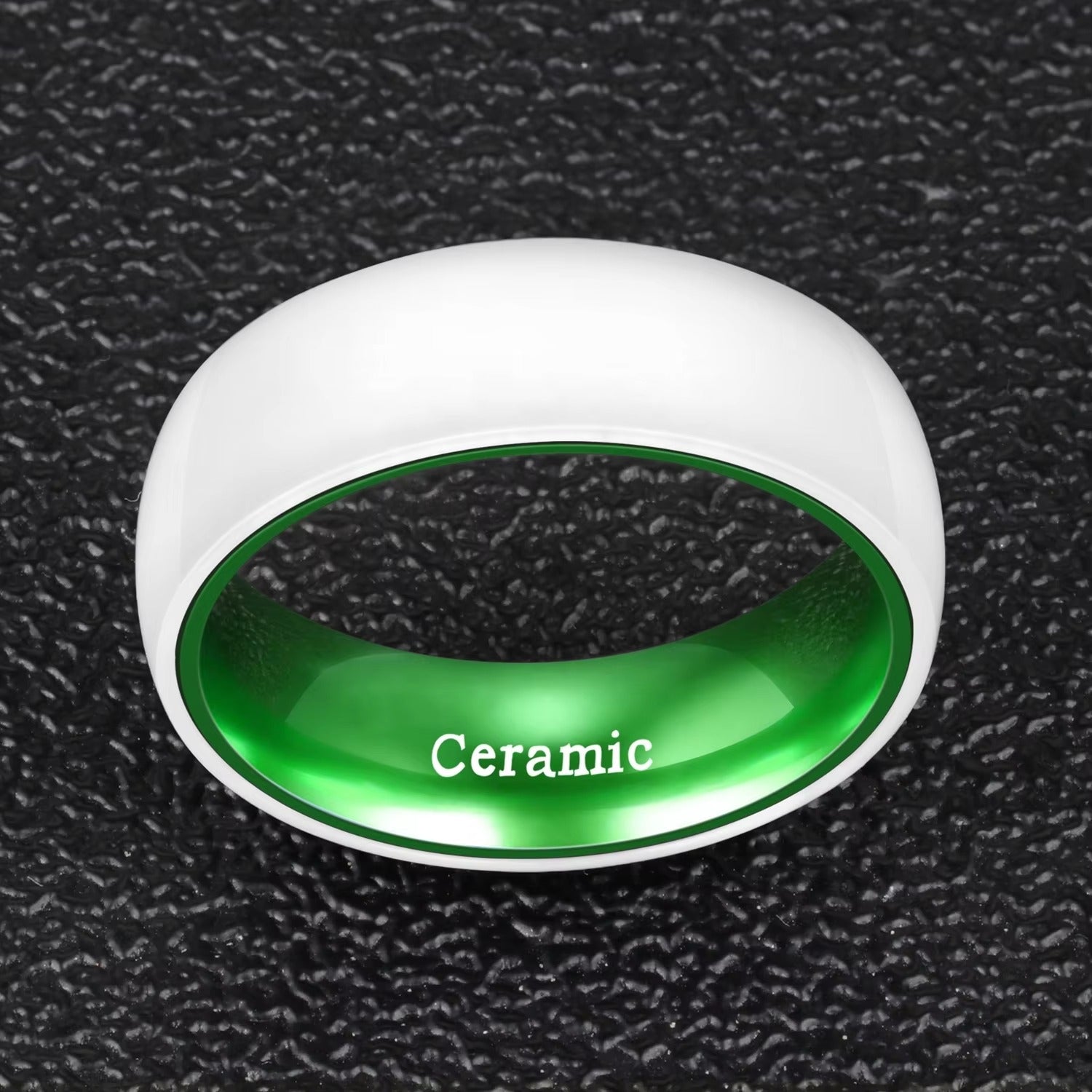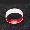 This 8mm domed white ceramic ring combines modern aesthetics with durability. Featuring a stylish anodized red aluminum sleeve inlay and a robust tungsten core, it’s designed to make a bold statement without compromising on comfort. Perfect for weddings, engagements, or as a special gift, this unique piece offers both elegance and lasting quality.