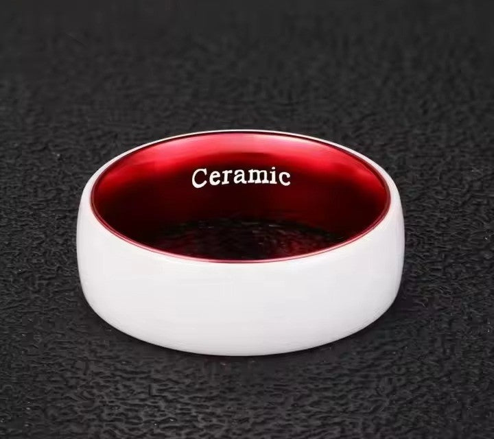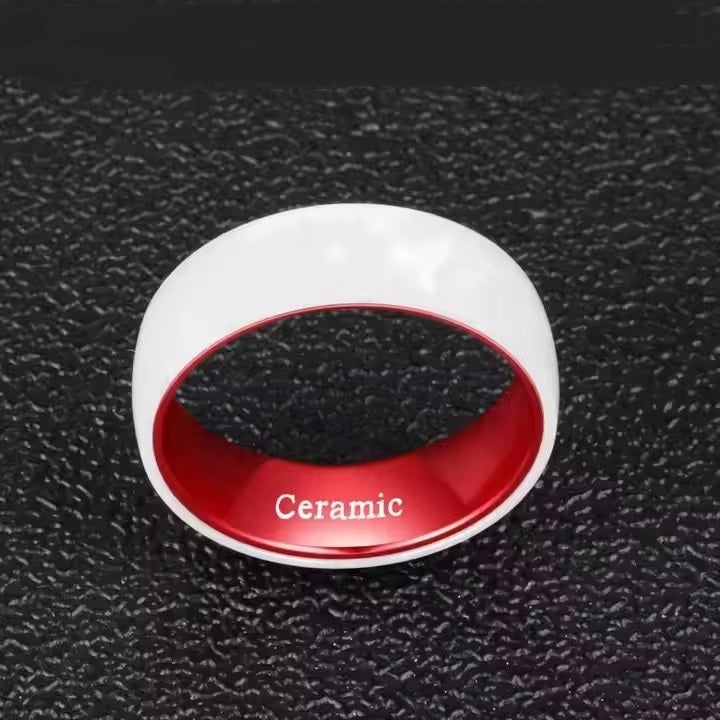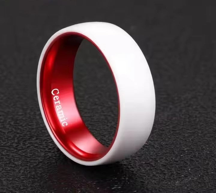 Modern Design: 8mm domed white ceramic ring with anodized red aluminum sleeve inlay.